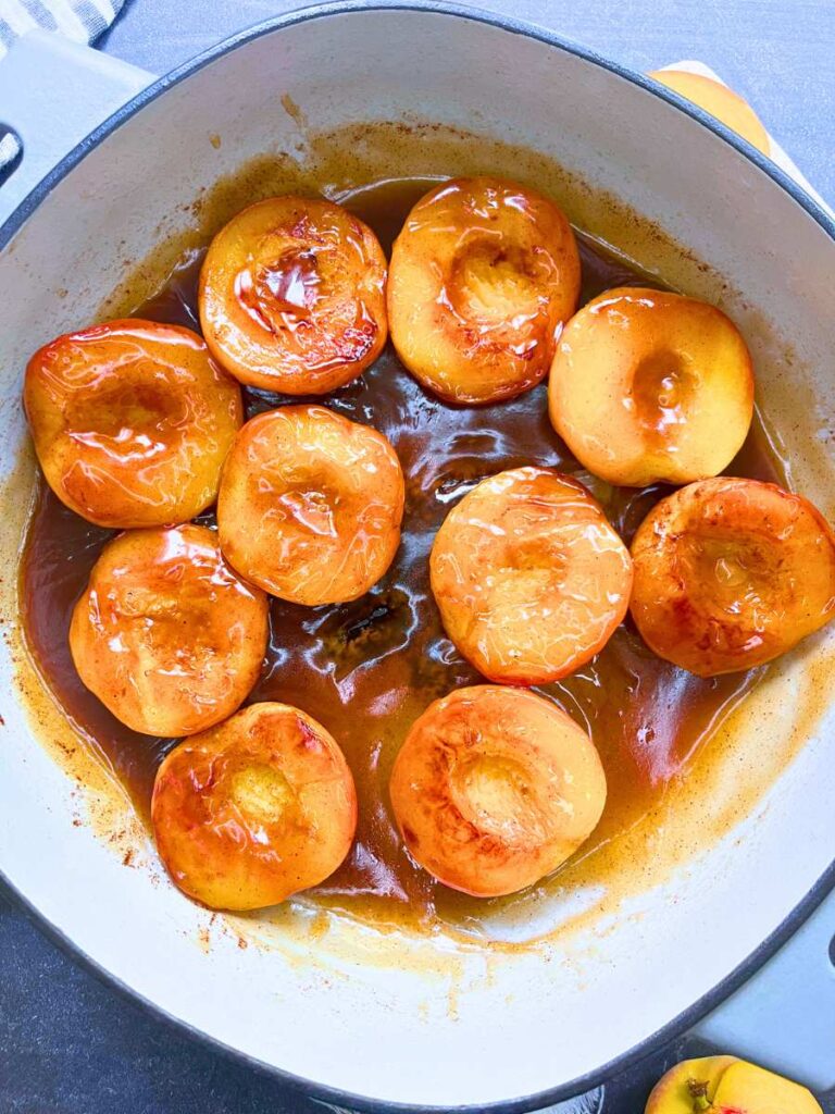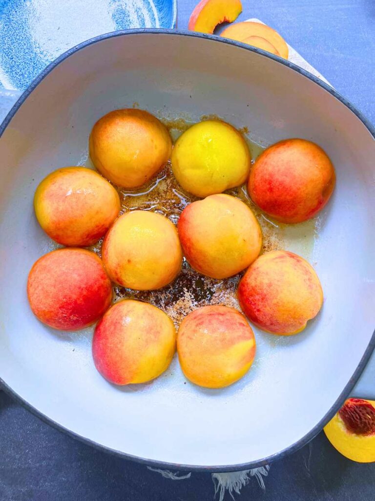 - Place the peaches in the bottom of the pan, cut side down, and allow them to cook and brown slightly.