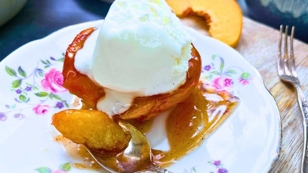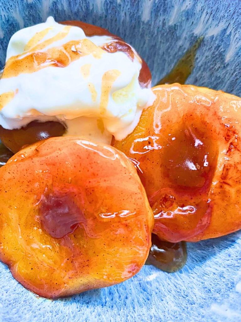 These easy caramel baked peaches transforms fresh peaches into an elegant dessert. The natural sweetness of the fruit infuses into the warm caramel that’s flavoured with touch of warm spices. Whether you’re entertaining guests or craving a quick treat, this recipe is the perfect dessert.