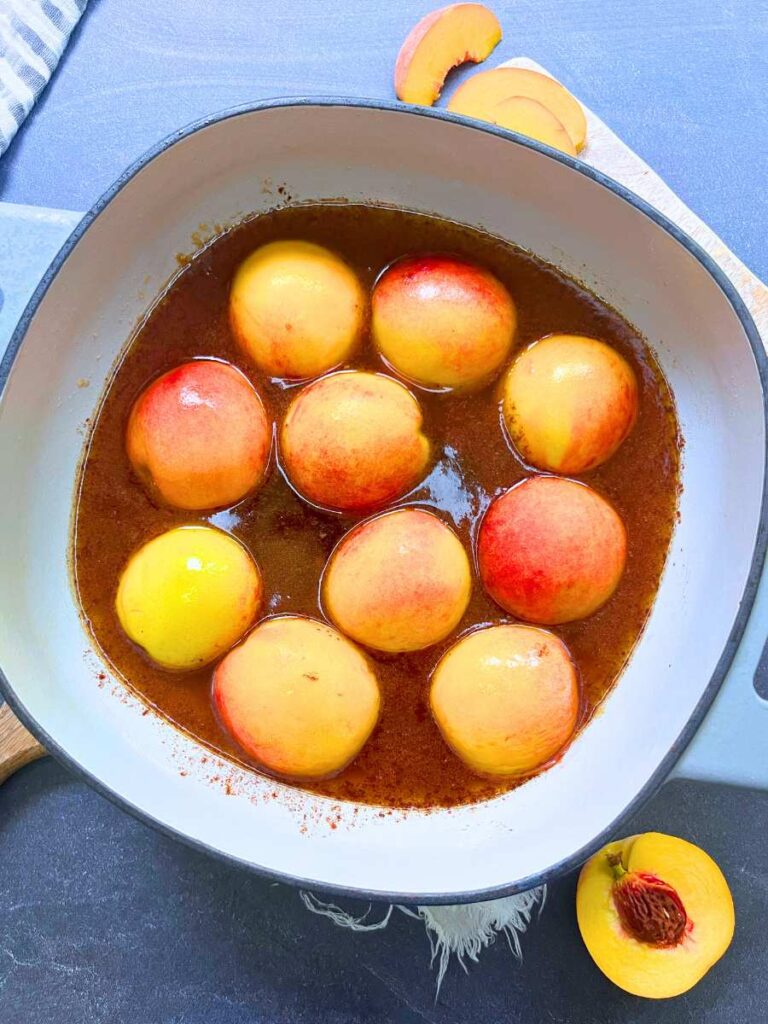- Return the peaches, cut side down, to the pan with the liquid.