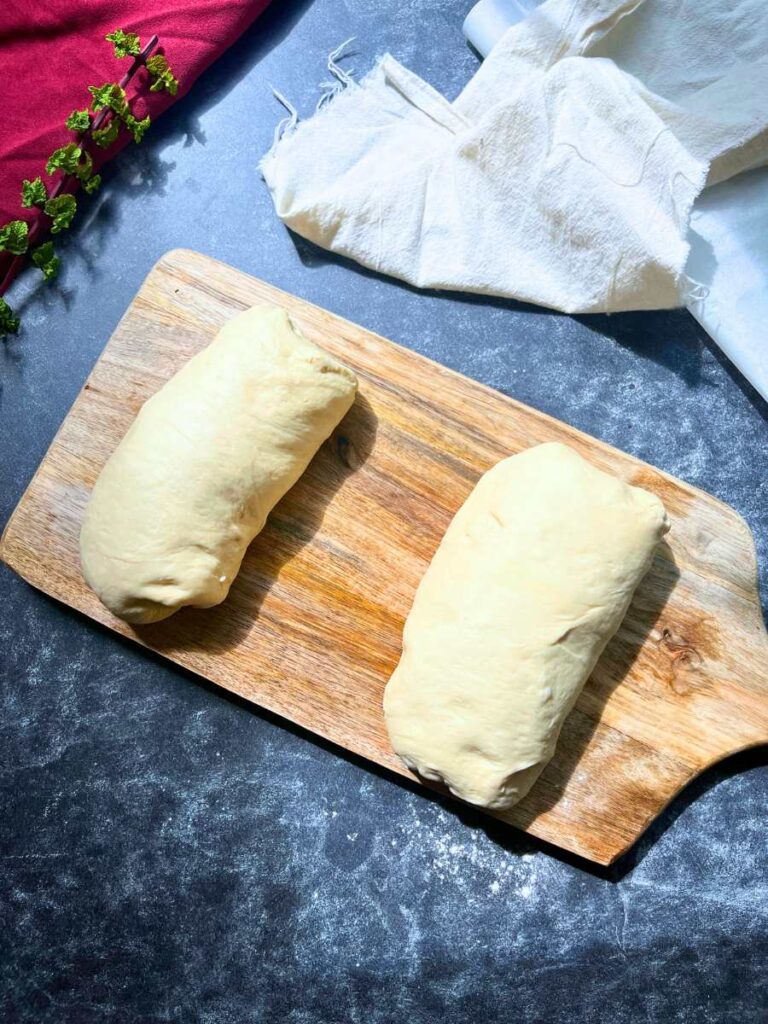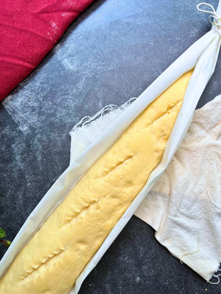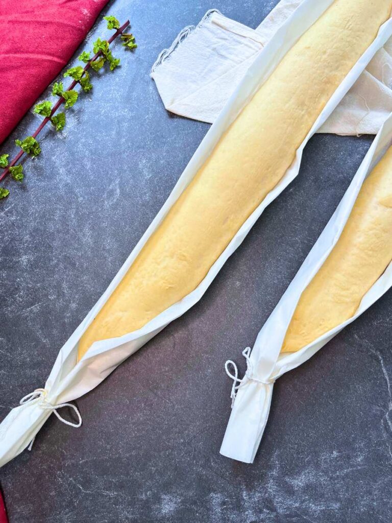 - Place all three (or two) in a floured couche, or on a folded, floured piece of parchment paper slightly longer than the loaf. Tie a piece of twine on each end to form the parchment paper into a half cylinder, so they will hold their shape as they rise. See video for more details