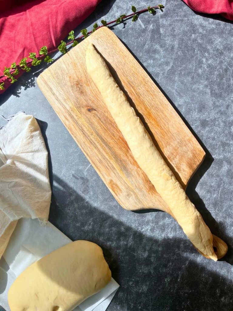 4. On a lightly floured surface, lightly press and roll each portion of dough into a long log about 12 inches long.