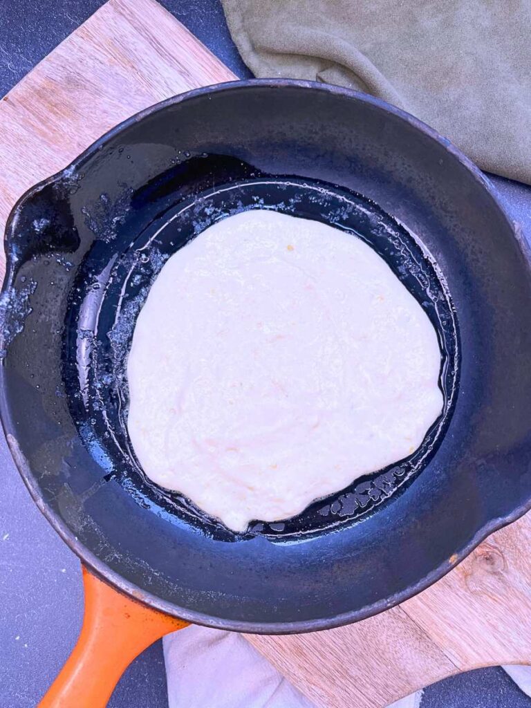 10. Allow to cook about 2 minutes or until bubbles start breaking on the surface and the edges of the pancake just start to set.