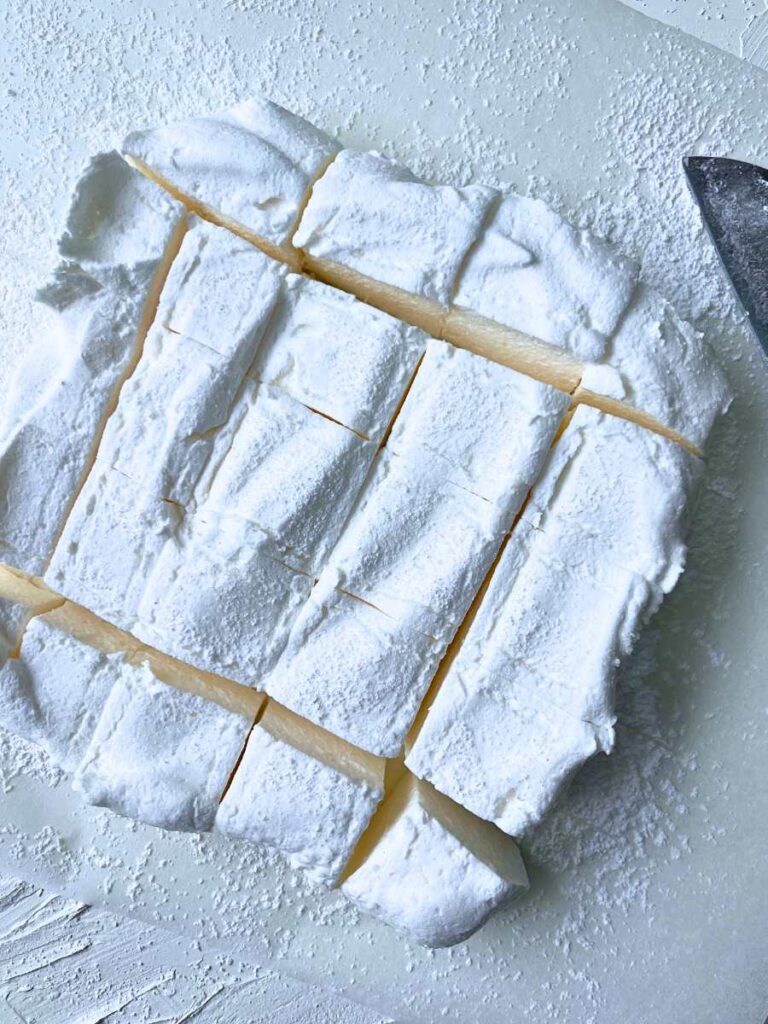 - After cutting, allow the marshmallows sit out for several hours to dry slightly and form a delicate crust.