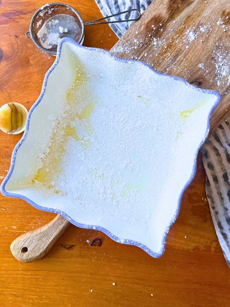- Lightly grease and dust with a mixture of powdered sugar and cornstarch a 9 X 13 in pan and set aside.