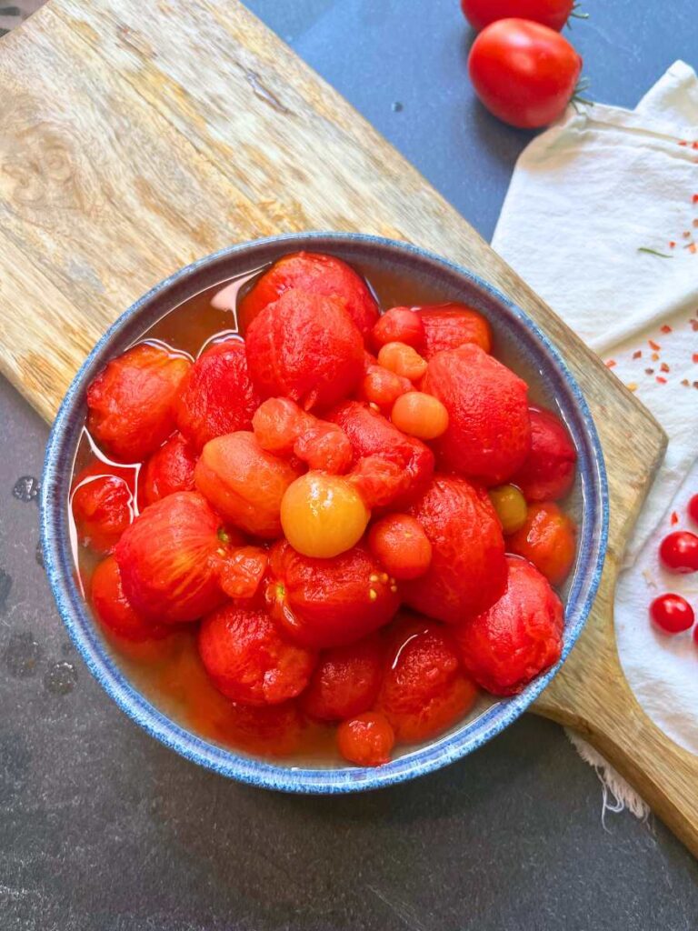 - With a slotted spoon dip the tomatoes and the bell pepper into the boiling water for 1 to 2 minutes or until you see the skin start to come away from the flesh. (You may need to do this step in batches.)