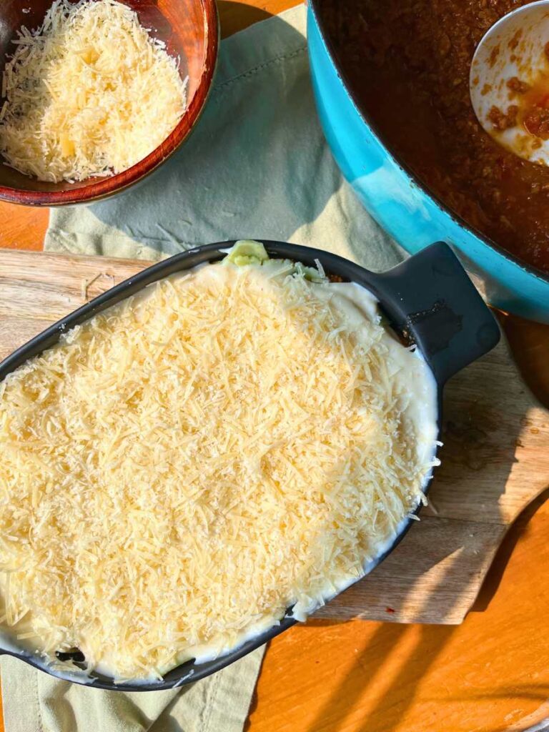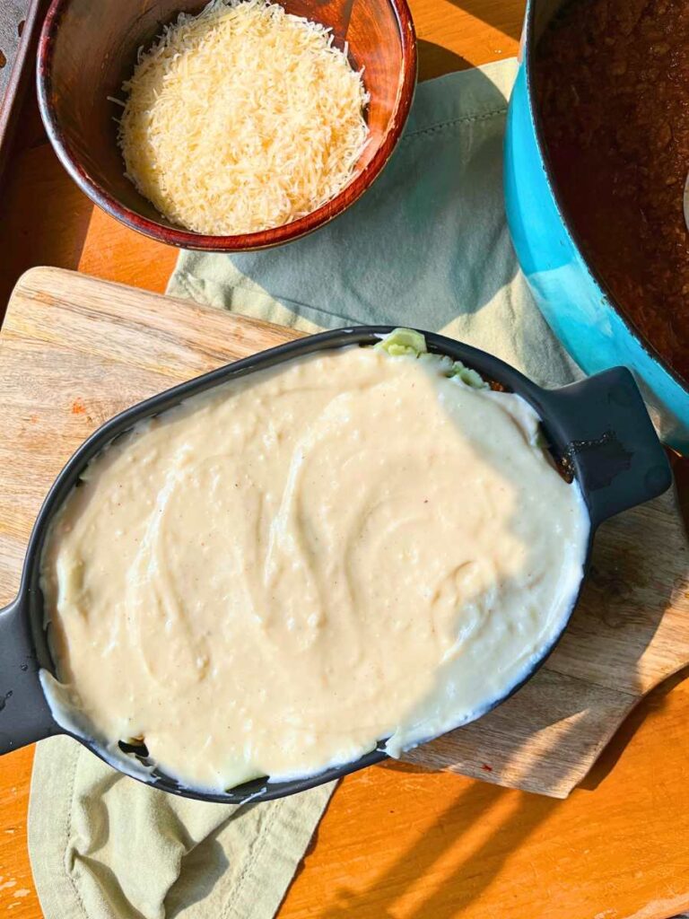 6. Repeat the layers, finishing with a layer of béchamel and Parmesan. You should have 5 – 6 layers.