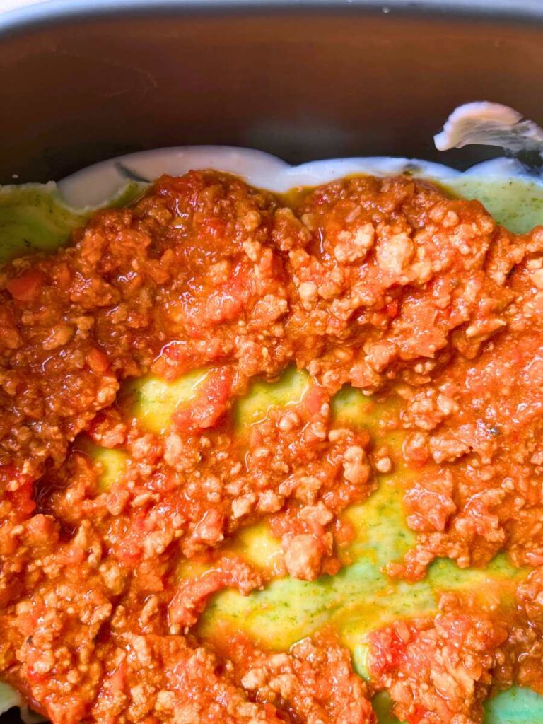 - Spread on a thin layer of the beef ragù and cover with a layer of pasta sheets.