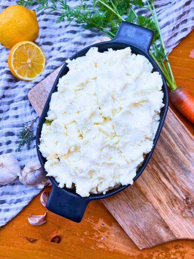 15. Transfer the mixture to a small casserole or oven proof dish and cover the the top with a layer of the leftover mashed potatoes. (If you don’t have any mashed potatoes leftover you can make your own fresh here!)
